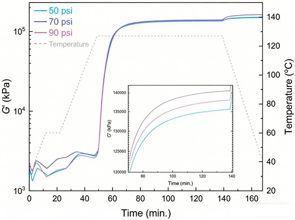 Alpha 与客户合作,利用封装样品流变仪(ESR)制定了系统化测试方案。分步控制压力变量:40、50、60、70 psi,同时保持固化温度与升温曲线不变。
